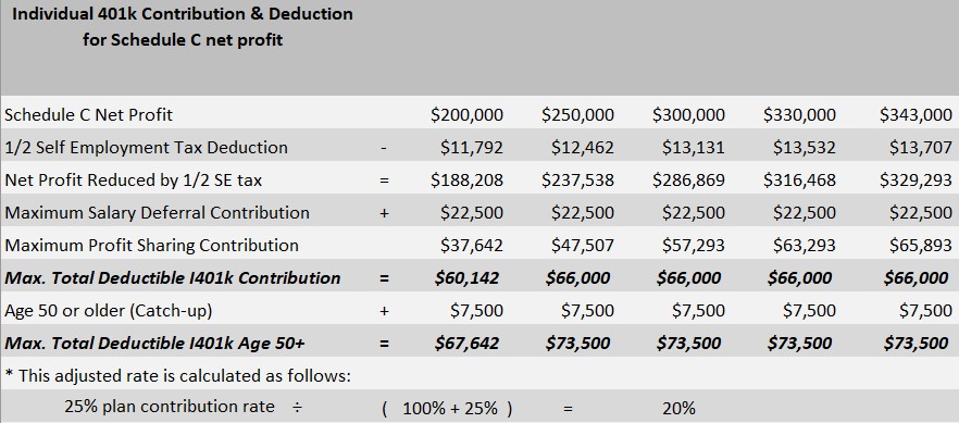 With the Individual 401k, you still need to make the adjustments for Schedule C net profit as you do with the SEP IRA. However, there are two significant differences consider: